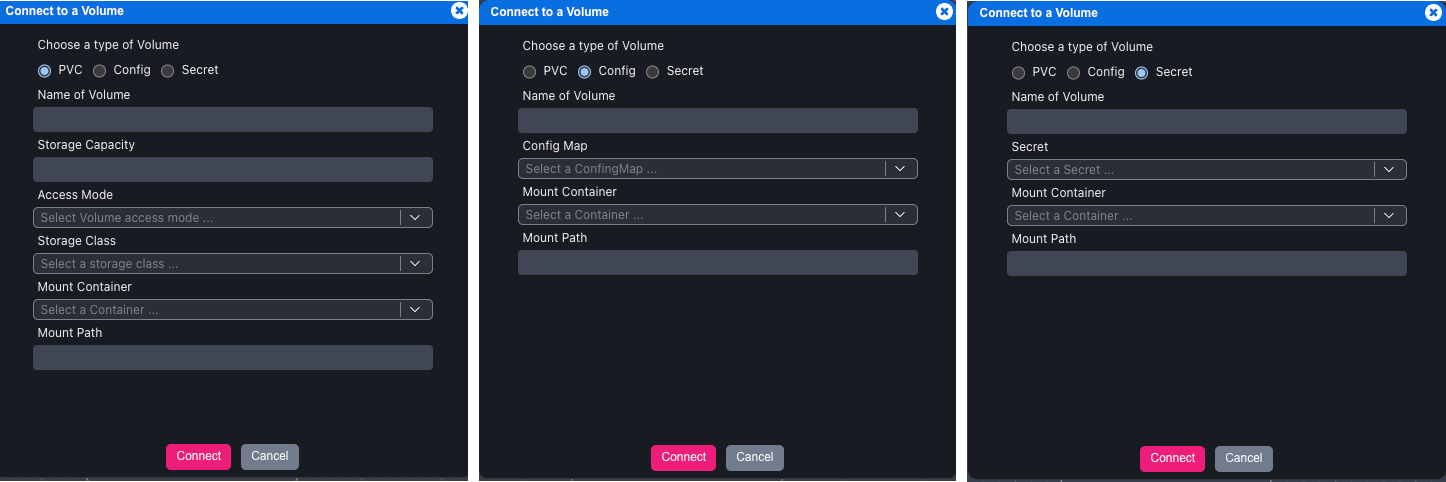 * **Connect Workload with a PVC (Persistent Volume Claim):** This helper window allows you to connect a volume with a workload. You can specify the type of volume (PVC, Config Map, or Secret), the name of the volume, the container to mount, and the mount path. In the case that you choose a PVC, you can also define the capacity, storage class, and the access mode.