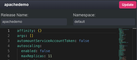 To update a release, select the release you want to update and navigate to the right panel. Here, you can change the name, namespace, and chart values to customize your release. Once you're ready to proceed with the update, click on the "Update" button.