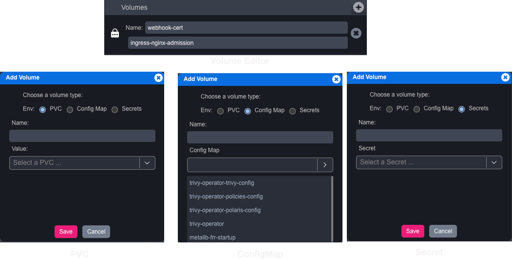 4. Volumes: (only for workloads ) Let us edit and display the different volumes "PVC, Config Map, or Secret" attached to an object