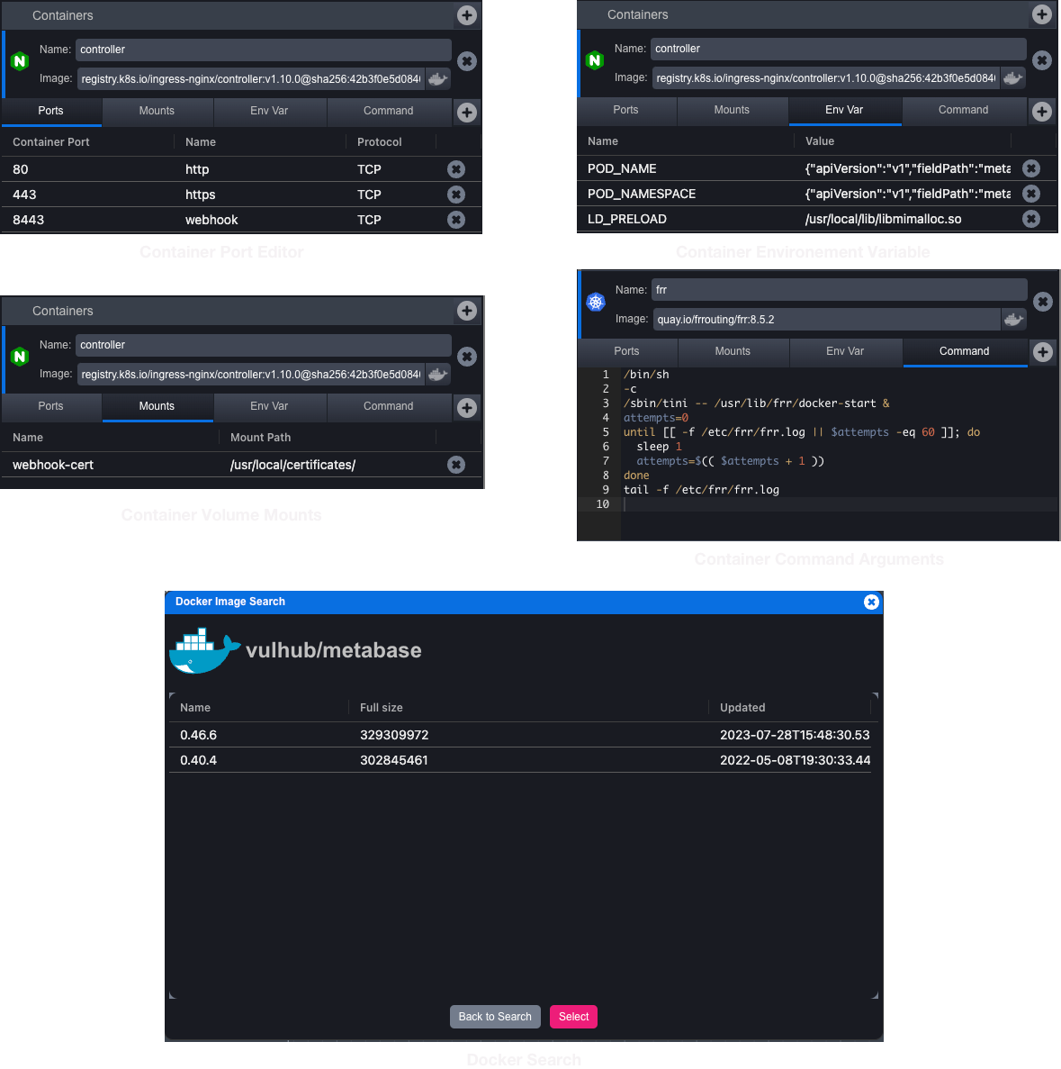 * **Container Editor**: Here we can choose the name of the container and the image. The images also have a Docker registry button that, when pressed, shows us the Docker registry dialog to help us search and find the right image and version.